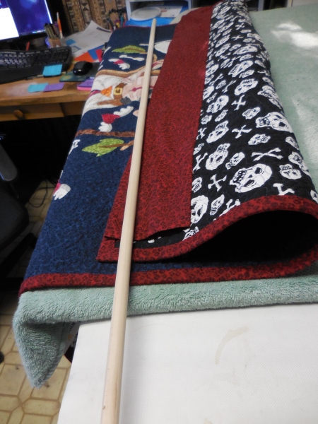 I delivered a quilt yesterday, so I had to put a label on it, dehair it, and provide sticks of hanging.