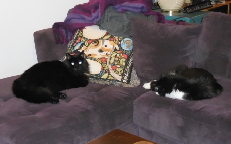 I was sitting between them, but they stayed when I extracted myself and did not hiss at each other.