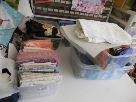 Hers are in the big bin on the bottom and one of the bins in back. The others are from the Ventura quilt and I can’t put all of them away, because I keep them out until the quilt is ironed together, in case I lose something. So three or four of the bins will have to find a home on the floor somewhere for the duration…and I pulled three pieces of fabric that were big enough for the backing before putting stuff away…