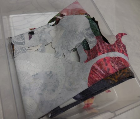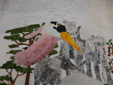 That’s the hardest part…getting everything to fit together with such tiny pieces and fussiness going on. But it did. At that point, though, I had this huge piece I was working on, and I needed more of the applique pressing sheet above, so I pulled the whole bottom section off and folded it up into a box…