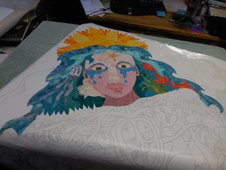 Then got the full face ironed together…this was the water section, so there’s a jellyfish, some regular made-up fish (Kathy-style), and a shell. Oh, and a starfish on her face…