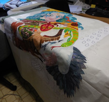 I debated ironing the whole thing together now or fitting the pieces together on the background. It is easier to just deal with one piece though, especially if it can be ironed down to the pressing sheet, because then I can stretch pieces to make them fit if needed…which is what this one needed. So here’s the head ironed to central torso…