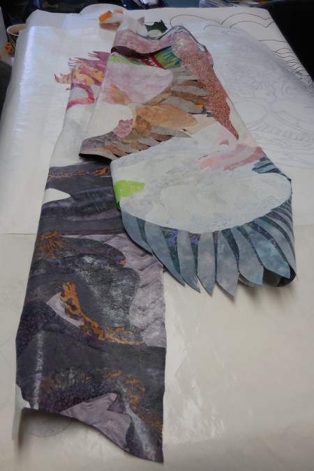 I didn’t get as far yesterday as I wanted to…as usual. My machine is also still in the shop, so that sucks. Hopefully it’ll be done today, because I can’t finish the ironing. I need to see the background together before I can iron the whole thing down.