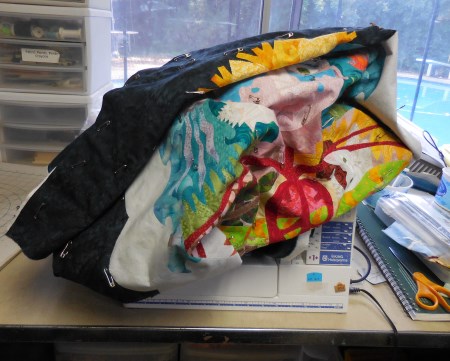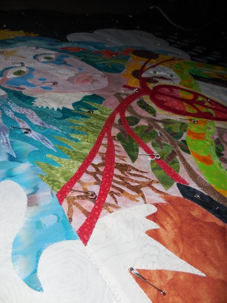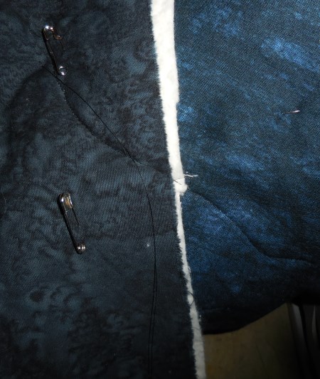 And pinbasted it. I have lots of people who ask why I don’t spray-baste. I’m not a fan of chemical overspray, and this thing is large. I don’t have anywhere flat to baste something this big except in the entryway. I might try it someday with something small, but then I forget and I don’t actually own any of the spray and it’s just way easier to pin it anyway.