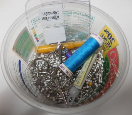 Growing up, it was always margarine containers of all different sizes, and I still have those for safety pins, but I like the see-throughness of this one for some reason. I seem to be running low on pins. They’re probably all pinned to something or in a box or container somewhere. I know when I die they will find pins and scissors everywhere. And needles. I have lots of needles. I’ve had those tiny scissors forever though…since I started doing hand-applique, which was around 19…um…I think 1992 or so? Not sure. They’re a little wobbly. The screw comes loose, but they cut fine.