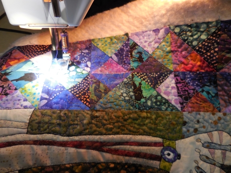 This is not a huge quilt, so I figured I could make a serious dent in the quilting last night. I wasn’t starting as late as the night before, so that had to be a good thing. When I finished the outlining, I had to make a decision about the background, which has 70 trillion colors in it and goes from dark to light all over the place. So I picked a variegated thread that goes from orange through green through purple…