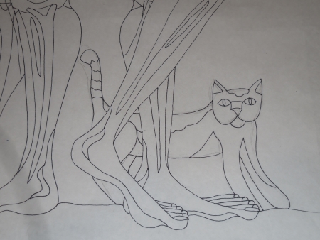 I went back and looked at the long skinny drawing to see if it needed more. I drew three different cats in pencil around the existing drawing, wanting to fit one in, but not sure if I should. One of them stayed…