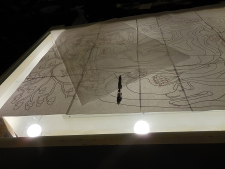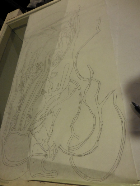 I’m using the new Wonder Under. It’s very plasticky. It sticks to the paper when I trace, which helps in that the paper doesn’t move as much as it used to, but then it doesn’t let go of the paper either. Kind of different…but the paper’s not releasing from the fusible either, so that’s a good thing. I’ll probably be tracing all week. I’ve got a bunch of stuff on at night this week, so I won’t get a lot of art time, I think…although I do try every night. It doesn’t have to be more than 30 minutes though. Last night, while tracing, I got a thunderstorm running through town…thunder, lightning scared the animals, and then it rained heavily for a while. We need it. Plus it’s kinda cool to be awake really late and see the light flashing and hear and feel the boom…then waiting as the quiet pitter patter turns into waves of rain pounding down.