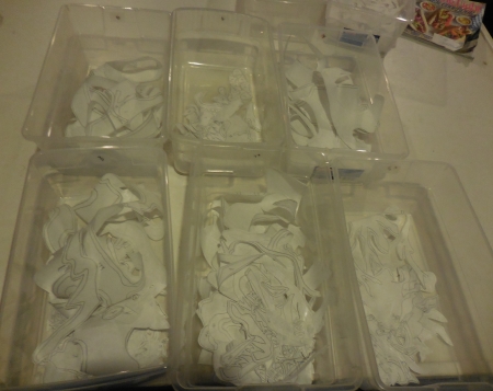 So after grading until I wanted to crawl into a cockroach-infested concrete box (watching too much weird TV), I gave up and did other stuff. I sorted all the Wonder Under for the first bathtub quilt, which is actually Bathtub 2, because I like to be confusing like that.