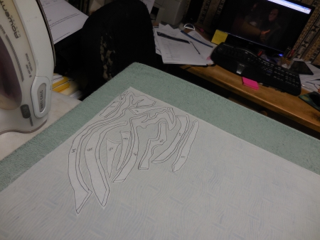 You can see the whites, such as they are, in the left column in the middle. So I didn’t do a ton of pieces last night, maybe 50? But they were huge and complicated and took a long time to iron and cut out.