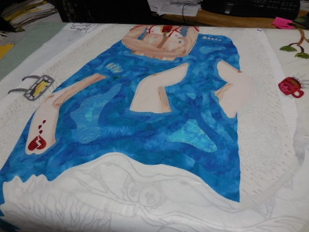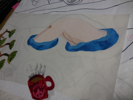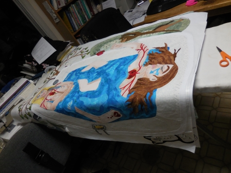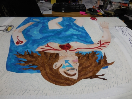 It’s hard to see, I know. It will be better when it’s on the background and I can hang it up. I have 8 hours into the ironing and still there’s another hour or so to get it down on the background. It is all in one piece, though, which is nice. Much less fussy than some quilts I’ve had to iron down. The gingko tree will be the worst part of it; getting all those branches and leaves laid out right will be a pain in the ass, honestly.