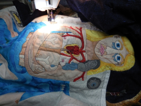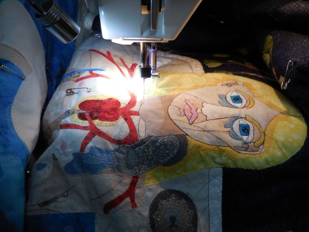 I have 5 1/2 hours into the quilting. I’m still outlining. I’ve been sewing pretty slowly, I guess. I am more than halfway done with the outlining, and because of the image taking up most of the background, there’s not much quilting outside of the outlining. I am going to use white thread in the bathtub area to deal with the shadowed areas, but otherwise I’m leaving the big areas alone. I am outlining the shapes in the water, but it’s pretty subtle I think.