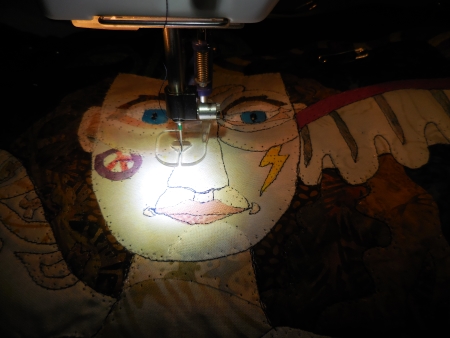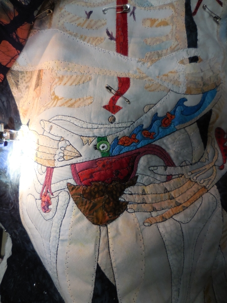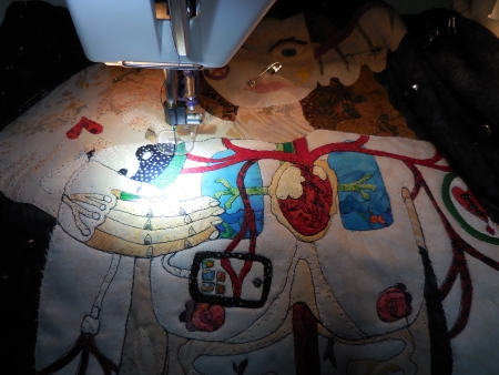 Really, I should walk away from the computer right now, but my text messages are blowing up over school stuff (crazy changes ahead, again), and I’m supposed to go to the gym and I don’t feel like it. I feel like sitting down and quilting for three hours and finishing the beast. Aargh. This is what happens over summer. I can’t do anything but make art because it feels like there isn’t enough time for everything and the art is the most important thing. Fuck house cleaning and handling errands. Just make art. It really is a drive for me, a crazy impulsive thing that runs through me and tugs me along in this direction and talks to me when I’m trying to fall asleep. It murmurs in my sleep, disrupting circadian rhythms. It knocks on my skull during the work day and in staff meetings. Right now it’s screaming pretty loudly, but so is my plummeting blood sugar, so I should deal with that too.
