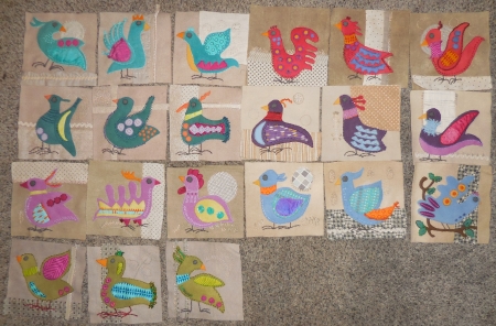 This is Sue Spargo’s Bird Crazy, started three years ago? Maybe 2 1/2 years ago. I have 21 birds completely embroidered and 9 to go…here’s the 6 I’m currently working on…
