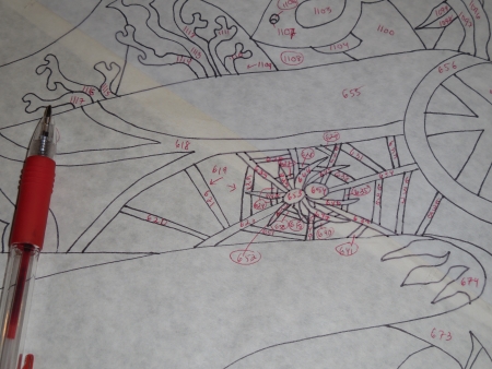 The night before, I numbered the whole damn thing, which is about 60″ square. It’ll probably be smaller than that at the end. Maybe. It took 2 1/2 hours just to NUMBER it. Huh. And you can see some of the crazy there in the spider web.