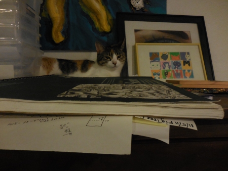 Kitten was trying to lie ON the drawing, UNDER the drawing, IN the drawing, so I banished her…to the top of the piano, on all my drawings and sketchbooks…