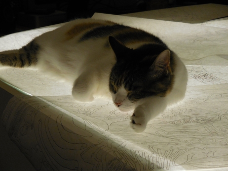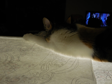 Once we left there for my parents, where there were lots of people and girlchild cooked, and I did manage to sit through dinner without cutting stuff out, I got really tired. Something about not sleeping well or long enough for two many nights in a row. So I went home and took a 20-minute nap. I do actually set the timer on my phone to wake me up. And that and a significant dose of tea woke me back up long enough to finish tracing the damn thing. First I had to readjust this sweetheart…