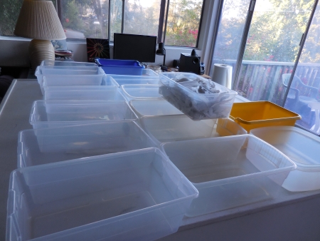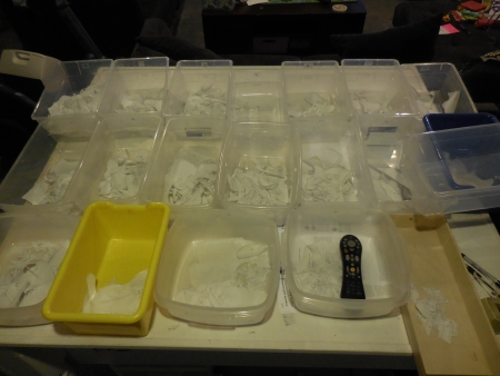 It doesn’t look like much, does it? Then I found a plastic bin for each 100 pieces, not an easy feat at the moment…