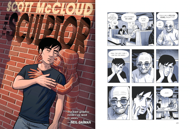 I’ve been sitting on the couch and watching stuff saved on Tivo and stuff on Netflix, and then I’m sewing some wool bits to other wool bits, nothing fancy, just basic. Because I can’t deal with anything beyond that. Last night, I tried to go to bed at a reasonable hour, but then didn’t fall asleep until after 4:30 AM. At some point, I finally got up and read a book. An entire book. The Sculptor, by Scott McCloud…