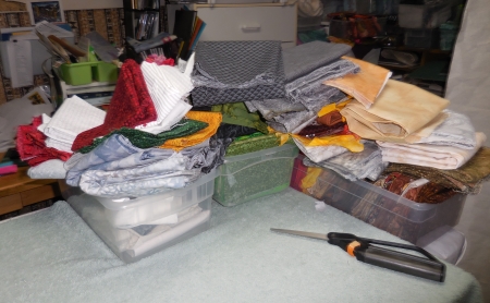 Because that’s 151 different fabrics used. It took 23 hours and 49 minutes to pick fabrics for about 1875 pieces. That’s it. No biggie (cough). Earth Stories took longer (had more pieces). Last year’s biggie took 22 1/2 hours to pick fabrics. Makes sense. This one is about 100 more pieces. Which means I only have about 80 more hours to put into it (oh dear. I’m not sure it helps to know that number). It’s OK. I have no life. And in 3 weeks, the timesuckers leave for college. Ignore the job, right? And the other art project? It will be fine.