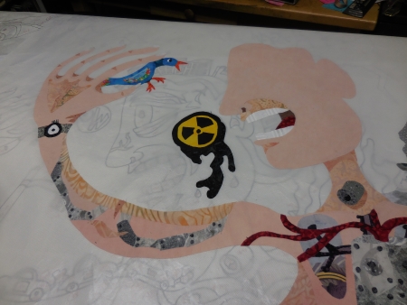 So reworking the goal. Finish ironing the head tonight. Maybe piece the background (wasn’t that Wednesday’s plan? Damn.). Then come back from Boston and iron to backing and stitch down next week. It’s off the machine by Saturday. Then I get that 17-foot human done. In a week. Or so. Where did that panicked breathing come from? Meditate. That too.