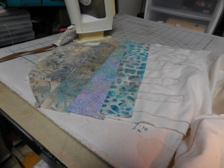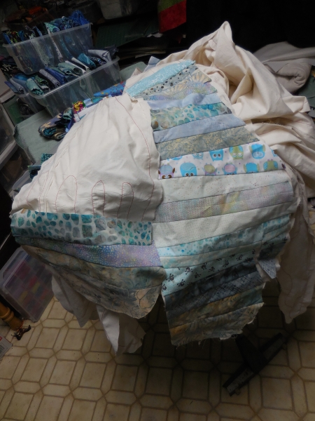 The biggest problem with this is that it’s unwieldy. I finally cut the arm away from the body, because it was easier to sew it that way, but the majority of the rest of it is sitting in my lap. And it will be seriously heavy too. Fabric is heavy. So I tossed a bunch of lighter fabrics in the mostly blue range onto that table and I sewed the one arm until I ran out of them. Then I debated in my head whether to pick another bunch and continue up the arm or whether to start the other hand, since they’ll both be hanging down together and I want them to be similar, but not the same.
