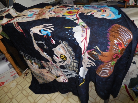 OK. Off this and onto the floor with pins. I hear Sion yelling…why??? Why not just spray baste like you did the giant-ass woman? Yeah. I don’t know. For one thing, I don’t have any spray baste. For another, I still like the pinning better. Crazy, I know. But those snot cans were driving me bonkers. They were the best option for that quilt, but I don’t know if I want to do it again for something big. Certainly isn’t happening today.