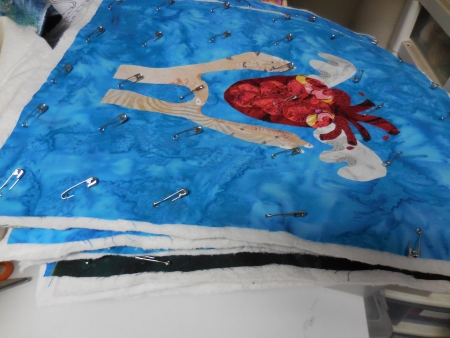 I sandwiched and pinbasted 9 quilts last night. Granted, they were all small, but I did pretty good. Here’s the stack of them…