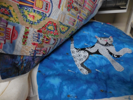 I found two large pieces of fabric that were relatively useful for backing…this Monet waterlily fabric you can see in the top left…
