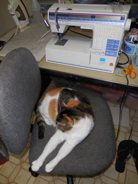 I moved her back a bit and perched on the edge. She’s not interested in the other chair at all, because I’m not in it. This one will do nicely thank you. Eventually, she left, but not until I was on the second quilt.