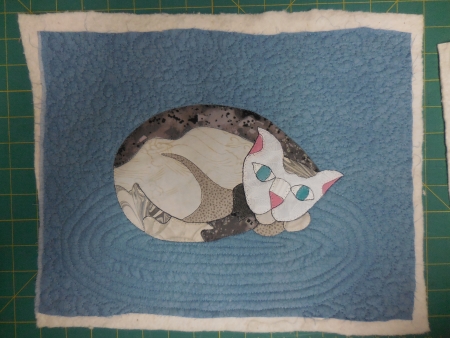 She sleeps like that all the time. They each take about 30-45 minutes to quilt. I suspect Cat 6 and the owl will take longer, because of the outlining. I do that first with a darker thread, and then background quilt after. It makes the cats pop up off the fabric nicely.
