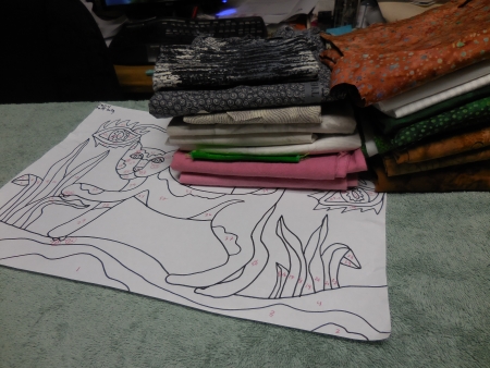 I found two large pieces of fabric that were relatively useful for backing…this Monet waterlily fabric you can see in the top left…