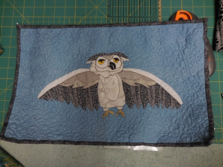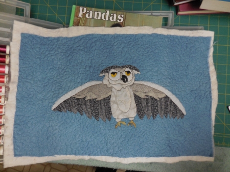 I planned to finish grading one assignment last night, and it was so long and drawn out, the answers so tortured themselves that I felt like crawling under the couch to escape them. I finished though and then came in here to do whatever I was gonna do. Oh yeah, finish quilting the owl.