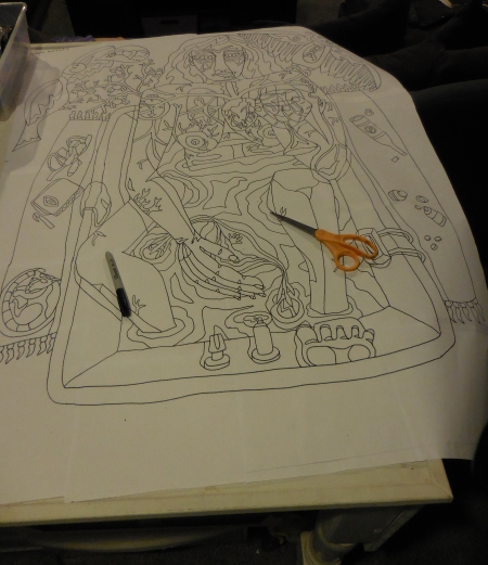 So I did pick up the car, give blood for my pre-MRI evaluation, so they know they can inject me full of stuff again without hurting me, and then enlarged the drawing I had decided to do next, one of the Bathtub series…number 5 in fact. I wonder how it feels to be one of the Bathtub rejects. Like I jumped numbers 3 and 4 and went to 5. Are they butthurt? Are they sad? Do they know I might come back and do them? Actually, I will never do 3, because it was a superfast drawing and kinda sloppy, and 5 is a redraw of the idea, so I don’t need to do 3. And I picked 5 over 4 because 4 is really depressing and I like 5 better moodwise. Don’t even ask about 1. It’s currently headless. I did enlarge it, but it needs work.