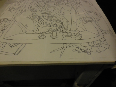 Once I enlarged a drawing and wanted to add a head to the figure in the drawing…it just had the bottom part with the chin and lower lip. I drew the whole new head…and then cut it off. Taped a new piece of paper on there and did it again. Got it right the second time. I really don’t think of my drawings as precious pieces of art…they’re a means to an end.