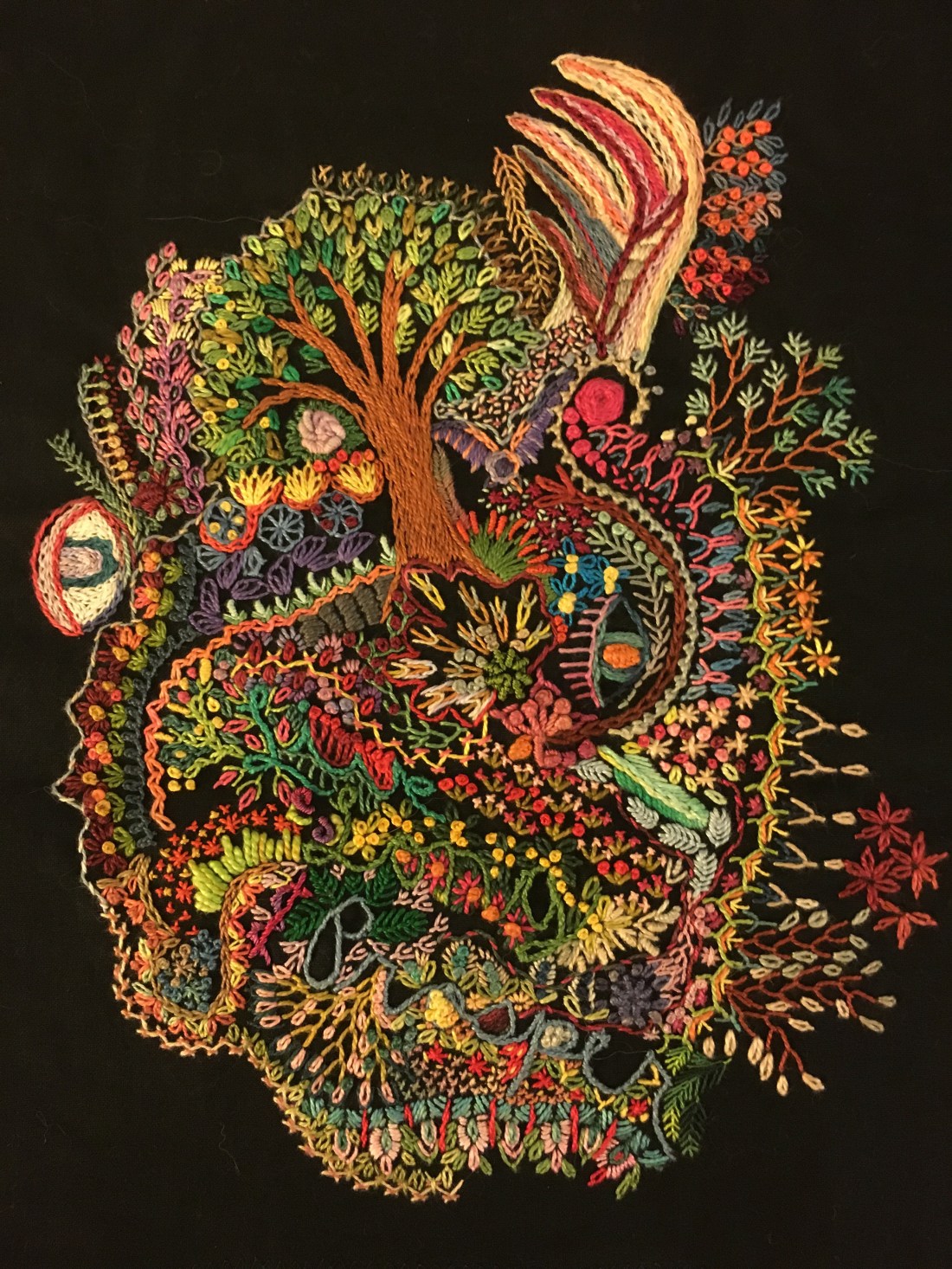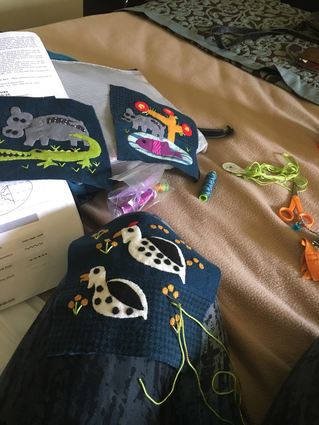 I managed all three days on this piece, all around the hand…fly and cross stitches…