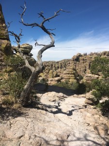 I have about 3,000 pictures so far and probably not the internet to publish this (I’m gonna try anyway). Saturday, we drove a long way to Chiricahua National Monument (some bug just divebombed my wine…poor drunk little sucker), where we saw lots of birds, two deer, a skunk, three lizards, and the butt end of a coatimundi, just as we’d given up on seeing one. We did some hiking at over 6500′ and camped overnight in a gorgeous space that was unfortunately also peopled very closely by an incredibly loud family who said Shut up Don’t Touch That about 17 thousand times.