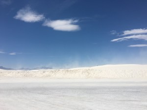 Our somewhat kamikaze trip continued today with a side trip to White Sands National Monument (never assume you can buy gas on a missile base) (I know how to coast a long way downhill). The wind had already started up by then, but not as bad as later, or we would have seen nothing…I’m pretty sure there’s white sand in everything I own right now.