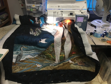 There’s the whole thing, all squished up for the last bit of quilting the background.