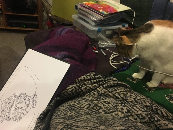So it took me a while to finish grading that period. It was about 9:30 PM when I settled down to draw, wrapped up in a wool blanket, a sweatshirt, a sweater, and pajamas. I was freezing. Kitten came out to help.