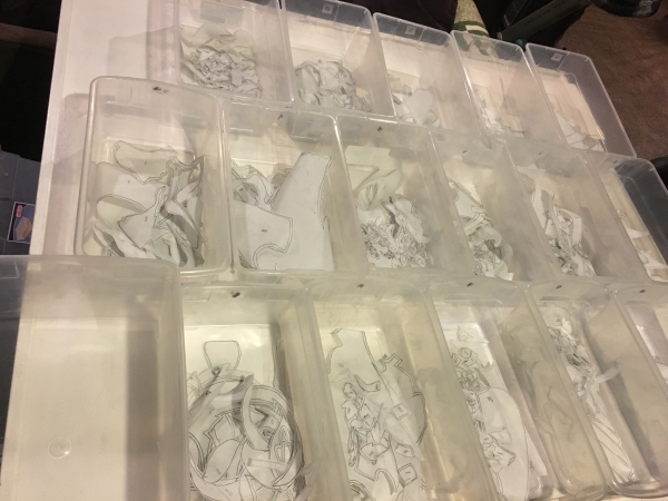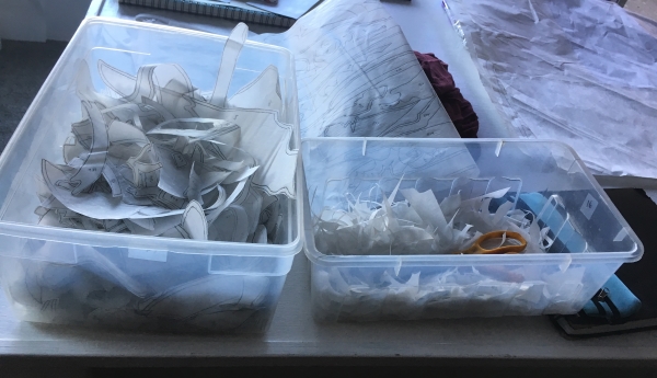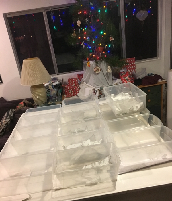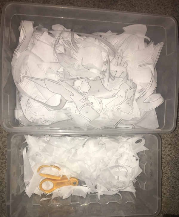 So I finished cutting stuff out in the early evening. I did some in the morning, while the windshield guy replaced my windshield. It’s a good thing he didn’t replace anything else, because obviously he’s the windshield guy. I shipped stuff to Seattle for Christmas, I went to the quilt store and got background fabric that I think I’ve used in another quilt. I really tried to get something that wasn’t dark blue, but my brain wasn’t having it. I got some other stuff too, including this one fabric with eyeballs on it that the nice woman cutting my fabric said looked like something I would use. Um. Wait. So you know who I am? Apparently yes. Weird. And then I got my hair cut shorter, hallelujah, because it was bugging me. All THAT! And some other stuff. Big pile of pieces on the left, trash on the right…wait, that’s not even the done box…because there’s still a yard of uncut Wonder Under underneath it.