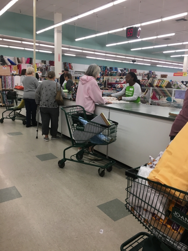 Before I got to do any artmaking last night, I had about 17 errands. I keep saying 17, but of course it was fewer than that. It took 5 hours though, maybe more. This was JoAnns hell. I hate coming here, but there were sales on Wonder Under and batting, and I needed a lot of both. So I waited. And waited.