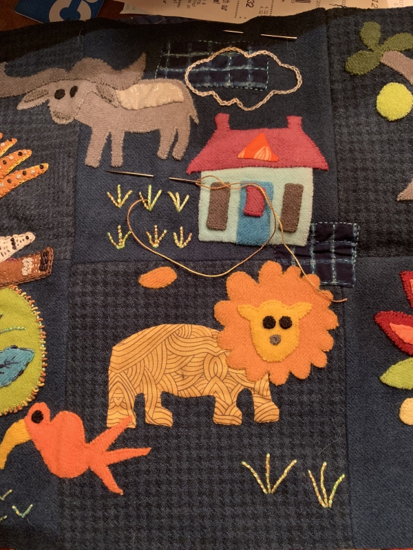 Seriously, I did the stems/leaves under the lion and next to the house. And I didn’t even finish. Stress does not help me stitch. Stitching helps with stress.