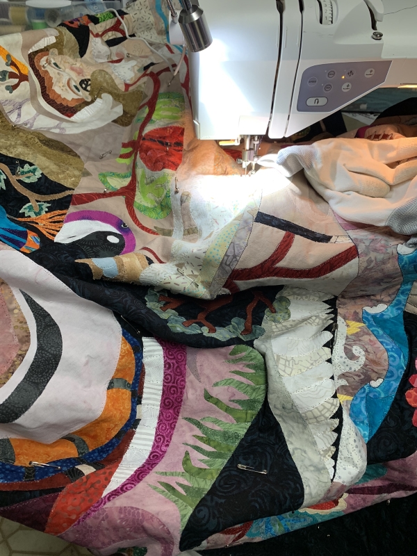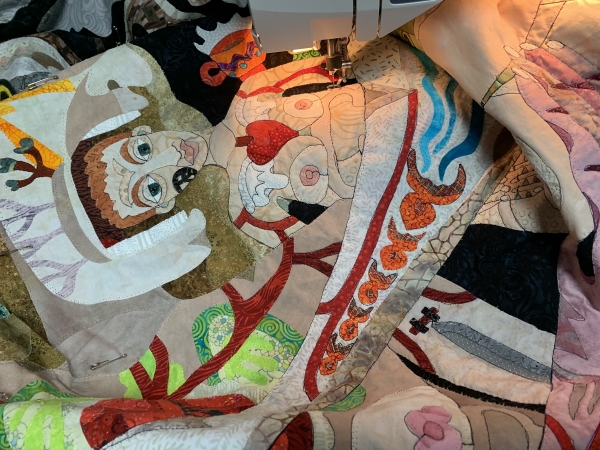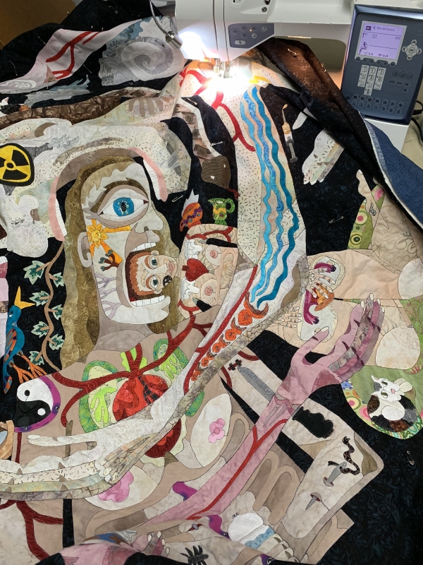 So that’s about half of the outlining I think? Maybe a little less…but I’ve done about half of the top arm of Figure 5 as well. And the background quilting is going to be bitchy on this thing, because it’s everywhere and not attached. So that will take time…lots of stops and starts. Or starts and stops. However that goes. So I won’t be done tonight, but I’m hoping to put in another 2 hours tonight. But first, 32 ounces of water and whatever else I’m going to have to drink (bleck) and then scan and pee a lot and drive some more and whatever. Do some schoolwork, hopefully walk the dogs, maybe finish some other tasks. Nap? I’d like to, but I don’t think it fits in my schedule. This is what I get for doing nothing of note on Saturday. Oh well.