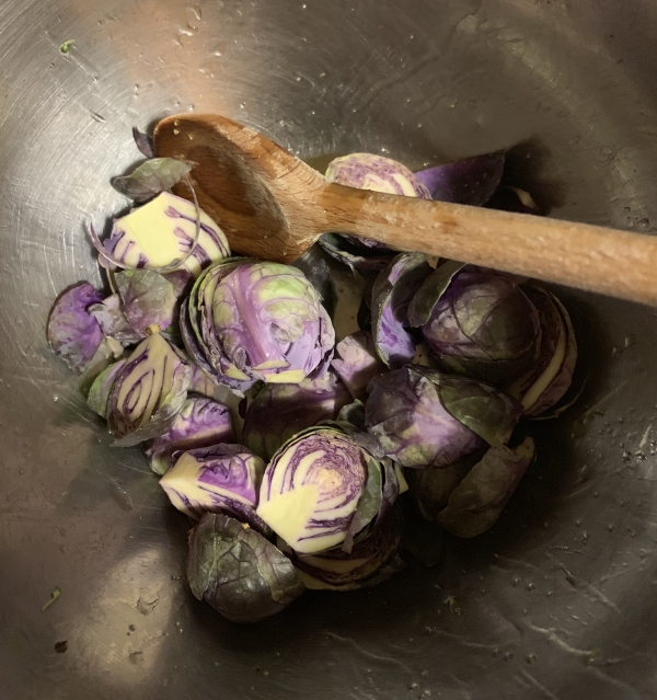 I was in charge of dinner last night, and our produce box got these awesome purple Brussels sprouts.