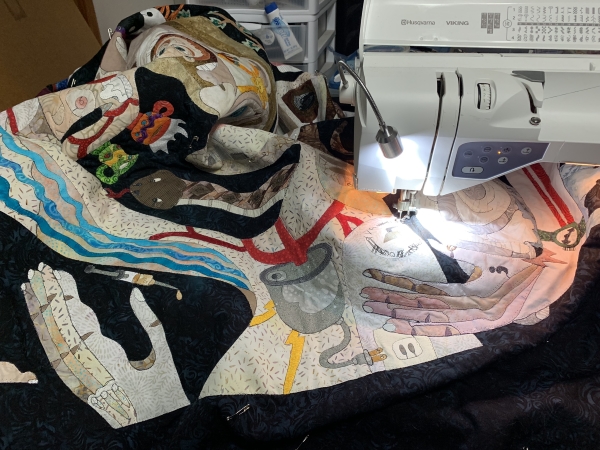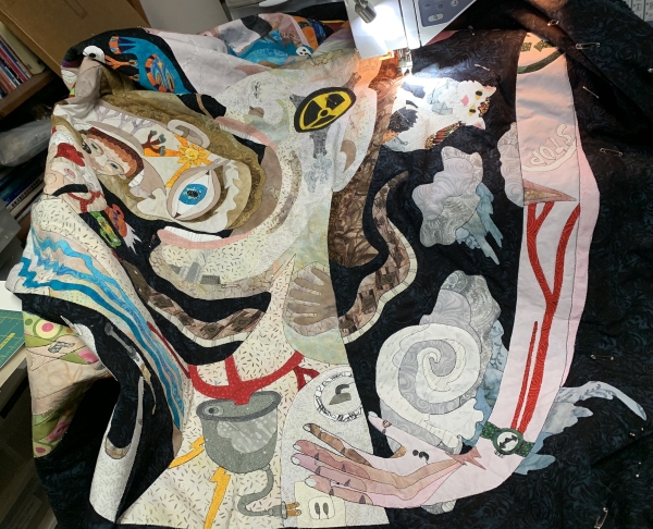 I wanted to finish the face of Figure 3, but that would have been past midnight, and I was already short sleep from yesterday, so I decided to go to bed…before midnight! I know, crazy. But probably the best choice for the week. I was tired. I’ll finish the head of Figure 3 tonight and maybe be able to move onto Figure 4. It would be nice to be done outlining by Friday night, then finish the quilting this weekend (the background is gonna take a while…look at all those bits and pieces), buy a binding, and get it on. Then start the drawing for the next one, before I start panicking. I don’t think the next one can be very big anyway. A max of 30″ wide? That’s nothing. I can’t remember if there’s a height restriction. Anyway. I’m getting there. I really love this piece…I just don’t love how long it’s taking me to get it done.