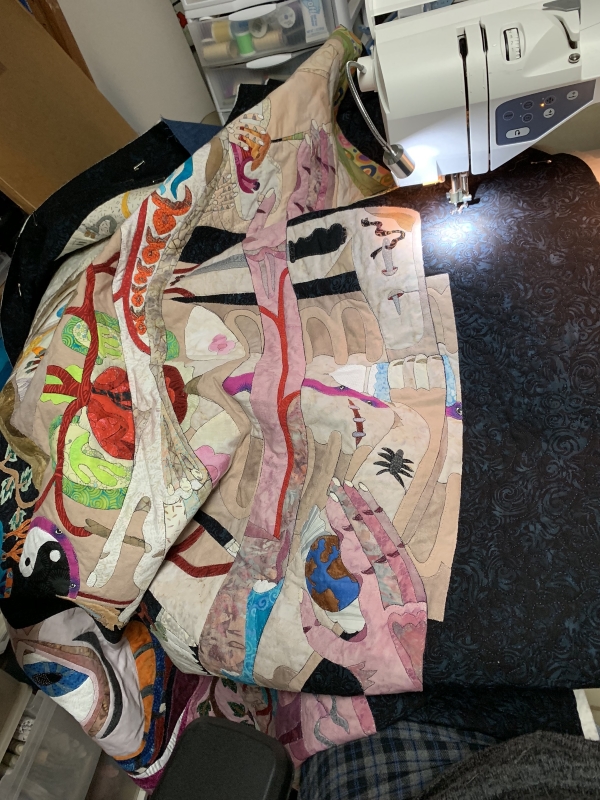 Otherwise I was pretty brain dead. I’m actually really impressed I got that much done. I finished one whole LOOOOONG side, almost. It took that long because the thread broke about 7 times and I had to replace at least one bobbin, and there were a few incursions into the figures where I had missed stitching the background before. In fact, looking at this picture, I may have some armpits to fill in. Not sure.