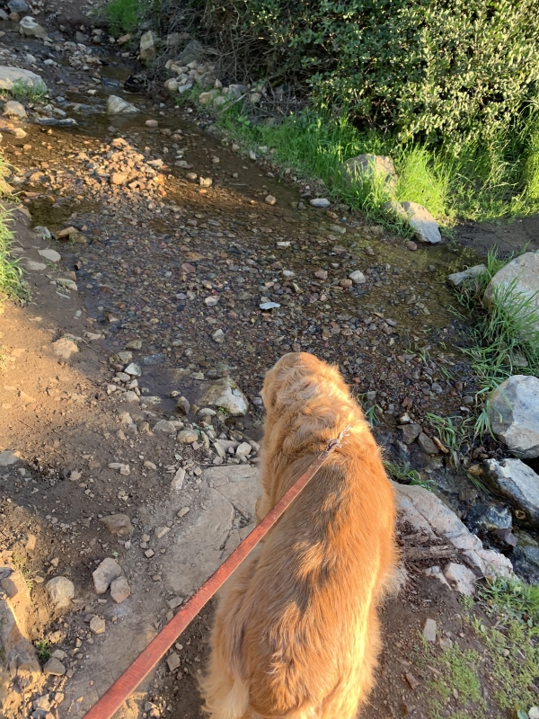 Calli has no problems or qualms about wading through streams. Simba is not as good. Definitely more water than usual…