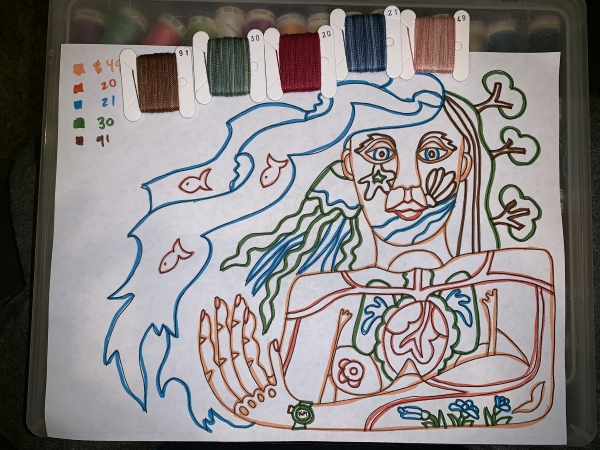 After the walk, I did some photo editing for work, some scanning for embroidery designs, some business paperwork, some email…picked colors for this one…