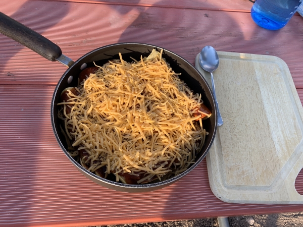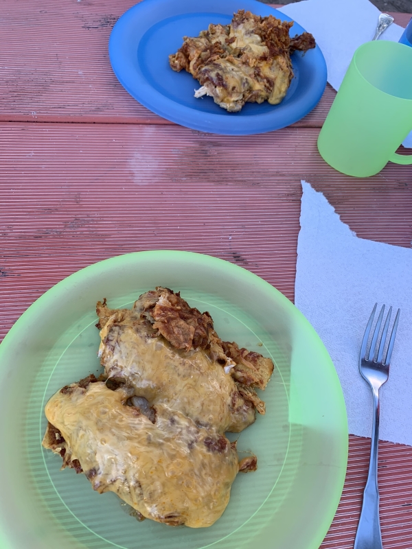 There was still snow in some of the campsites, but we liked this one well enough. It was pretty damn quiet. We made skillet enchiladas the first night…